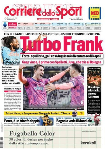 Il Corriere dello Sport, edizione Campania, ha dedicato spazio in prima pagina al Napoli: "Turbo Frank. Con il gigante camerunese nel motore lo scudetto non è un'utopia. Forza, equilibrio, gol: così Anguissa è diventato re di Napoli". C'è spazio anche per le partite domenicali: "Gasp vince, è primo con Spalletti. Juve, che tris al Bologna".