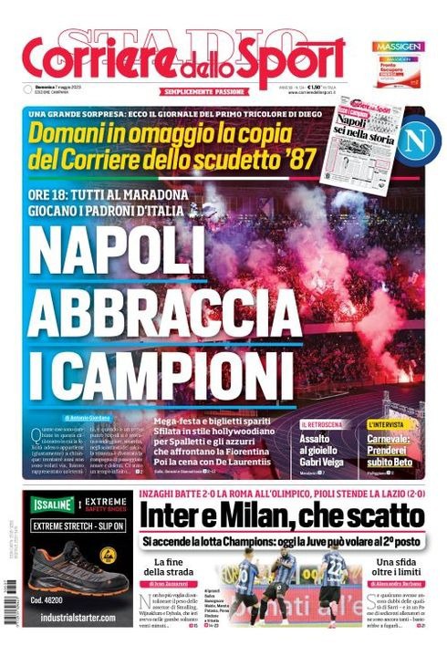 Il Corriere dello Sport, nell'edizione campana, apre con "Napoli abbraccia i campioni". Ore 18: Tutti al Maradona, giocano i padroni d'Italia. Mega-festa e biglietti spariti. Sfilata in stile hollywoodiano per Spalletti e gli azzurri che affrontano la Fiorentina. Poi la cena con De Laurentiis. In basso, il retroscena: assalto al gioiello Gabri Veiga. Poi l'intervista ad Andrea Carnevale: "Prenderei subito Beto".