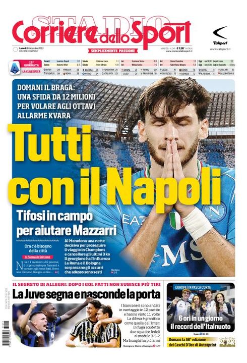 Il Corriere dello Sport, edizione Campania, dedica spazio in prima pagina al Napoli: "Tutti con il Napoli. Tifosi in campo per aiutare Mazzarri. Domani il Braga: una sfida da 12 milioni per volare agli ottavi. Allarme Kvara".