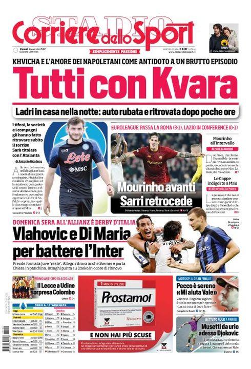 Il Corriere dello Sport, nell'edizione campana, apre con "Tutti con Kvara". Khvicha e l'amore dei napoletani come antidoto a un brutto episodio. Ladri in casa nella notte: auto rubata e ritrovata dopo poche ore. I tifosi, la società e i compagni gli hanno fatto ritrovare subito il sorriso. Sarà titolare con l'Atalanta.