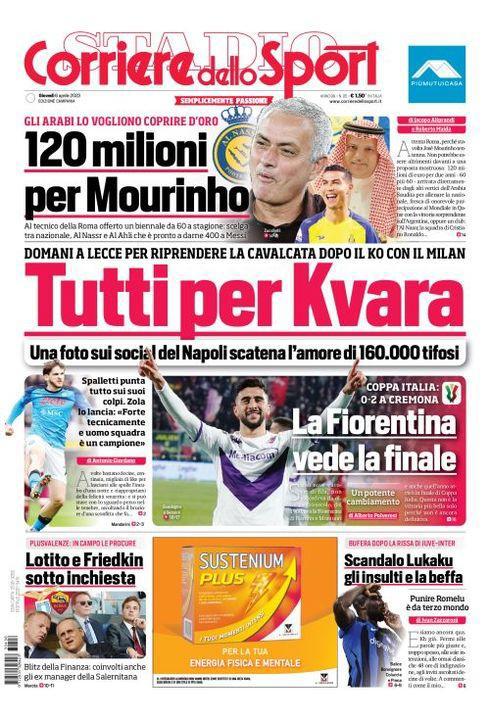 Il Corriere dello Sport, edizione Campania, dedica spazio in prima pagina al Napoli: "Tutti per Kvara. Domani a Lecce per riprendere la cavalcata dopo il ko con il Milan. Una foto sui social del Napoli scatena l'amore di 160.000 tifosi". C'è spazio anche per la semifinale di Coppa Italia: "La Fiorentina vede la finale. Coppa Italia: 0-2 a Cremona".