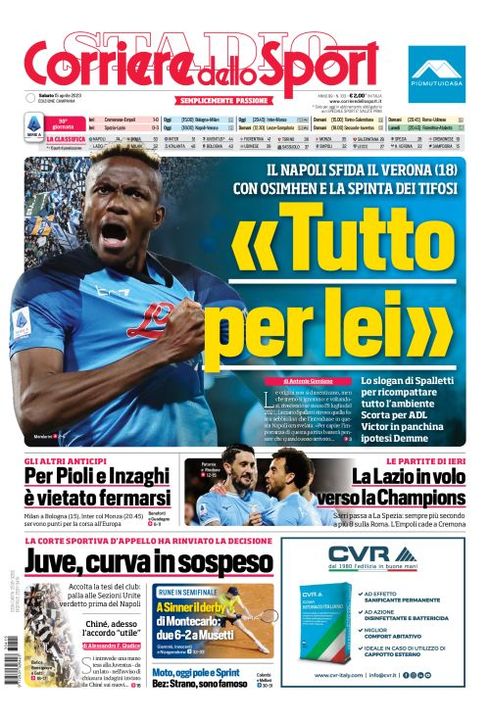 Il Corriere dello Sport, nell'edizione campana, apre con il rientro tra i convocati di Osimhen per il match tra Napoli e Verona e con il famoso slogan di Spalletti: "Tutto per lei". Il Napoli sfida il Verona (18) con Osimhen e la spinta dei tifosi. Lo slogan di Spalletti per ricompattare tutto l'ambiente. Scorta per ADL. Victor in panchina, ipotesi Demme".