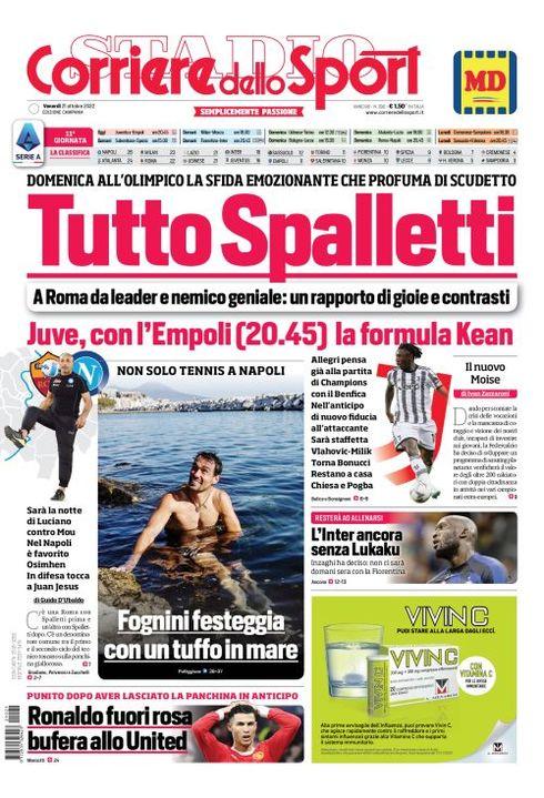 Il Corriere dello Sport, nell'edizione campana, apre con "Tutto Spalletti". Domenica all'Olimpico la sfida emozionante che profuma di scudetto. A Roma da leader e nemico geniale: un rapporto di gioie e contrasti. Sarà la notte di Luciano contro Mou. Nel Napoli è favorito Osimhen. In difesa tocca a Juan Jesus.