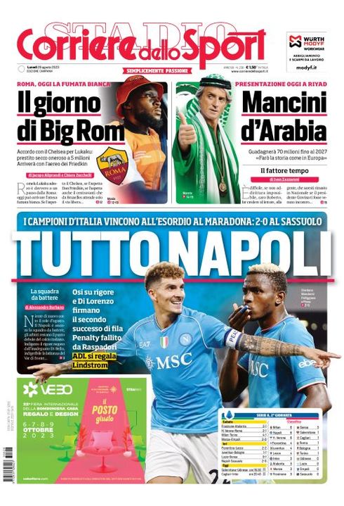 Il Corriere dello Sport, edizione Campania, ha dedicato spazio in prima pagina alla vittoria del Napoli contro il Sassuolo: "TuttoNapoli. I campioni d'Italia vincono all'esordio al Maradona: 2-0 al Sassuolo. Osi su rigore e Di Lorenzo firmano il secondo successo di fila. Penalty fallito da Raspadori".