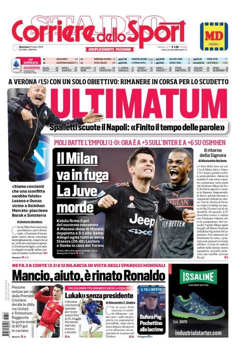 Il Corriere dello Sport, nell'edizione campana, apre con il match Verona-Napoli: "Ultimatum". Spalletti scuote il Napoli: "Finito il tempo delle parole". A Verona con un solo obiettivo: rimanere in corsa per lo scudetto.