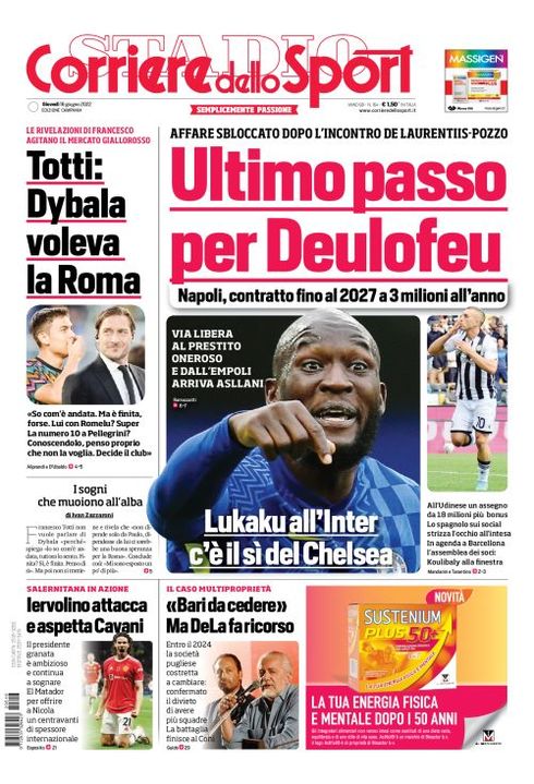 Il Corriere dello Sport, edizione Campania, dedica spazio al calciomercato del Napoli: "Ultimo passo per Deulofeu. Affare sbloccato dopo l'incontro De Laurentiis-Pozzo. Napoli, contratto fino al 2027 a 3 milioni all'anno". C'è spazio anche per l'Inter: "Lukaku all'Inter, c'è il si del Chelsea", e per la Roma: "Totti: "Dybala voleva la Roma".