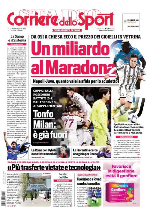 Il Corriere dello Sport, edizione Campania, dedica spazio in prima pagina al match tra Napoli e Juventus: "Un miliardo al Maradona. Da Osi a Chiesa: ecco il prezzo dei gioielli in vetrina. Napoli-Juve, quanto vale la sfida per lo scudetto!". C'è spazio anche per la Coppa Italia: "Tonfo Milan: è già fuori. Rossoneri battuti (0-1) dal Toro in 10 ai supplementari".