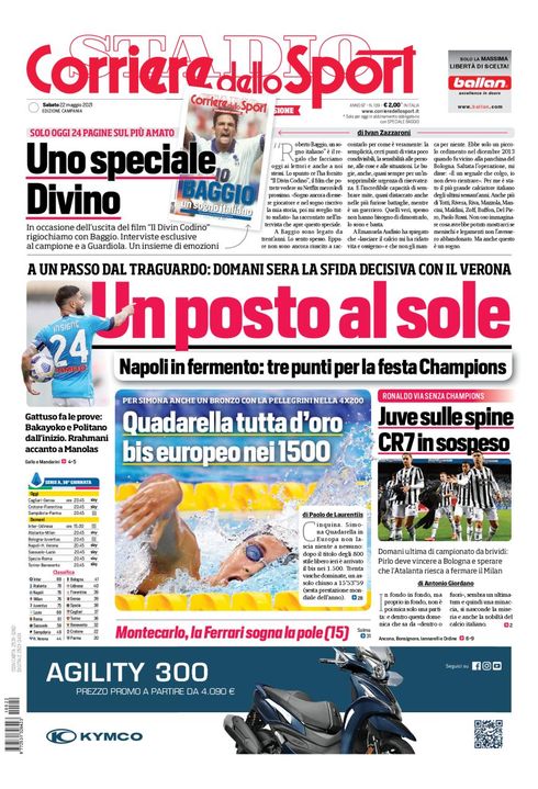 "Un posto al Sole", titola così la prima pagina del quotidiano Il Corriere dello Sport edizione Campania. "A un passo dal traguardo: domani sera la sfida decisiva con il Verona. Napoli in fermento: tre punti per la festa Champions. Gattuso fa le prove: Bakayoko e Politano dall'inizio. Rrahmani accanto a Manolas".