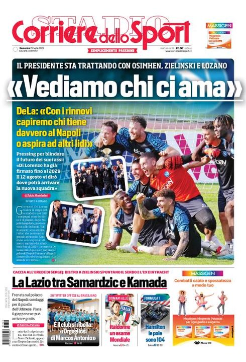 L'edizione campana del Corriere dello Sport si è soffermata sulle parole di Aurelio De Laurentiis, presidente del Napoli, alla presentazione della squadra a Dimaro: ""Vediamo chi ci ama. DeLa: "Con i rinnovi capiremo chi tiene davvero al Napoli o aspira ad altri lidi". Il presidente sta trattando con Osimhen, Lozano e Zielinski". Spazio, poi, in basso, anche al mercato della Lazio: "La Lazio tra Samardzic e Kamada".