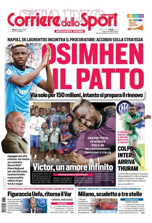 Il Corriere dello Sport, edizione Campania, ha dedicato spazio in prima pagina al Napoli e a Victor Osimhen: "Osimhen, il patto. Via solo per 150 milioni, intanto si prepara il rinnovo. Napoli, De Laurentiis incontra il procuratore: accordo sulla strategia". C'è spazio anche per la giornata di Osimhen in Nigeria: "Victor, un amore infinito. Grande festa in Nigeria per il re dei centravanti".
