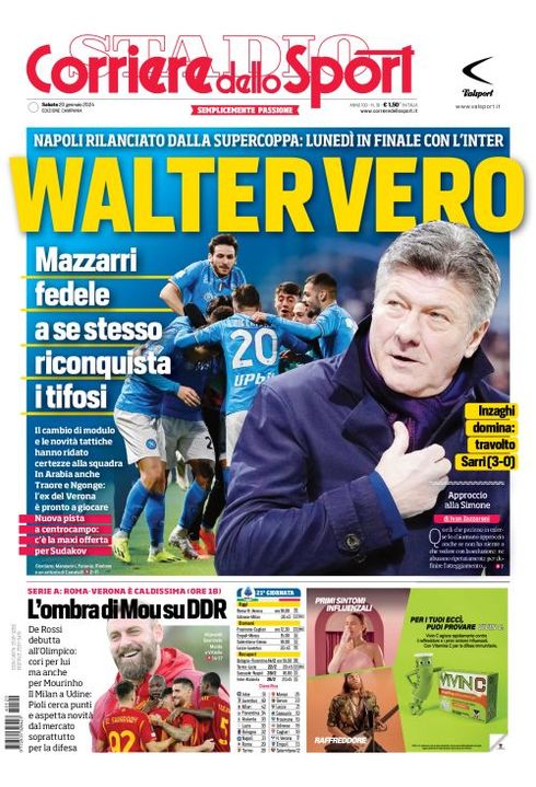Il Corriere dello Sport, nell'edizione campana, parla della vittoria del Napoli contro la Fiorentina nella semifinale di Supercoppa e della finale che gli azzurri giocheranno contro l'Inter: "Walter vero. Mazzarri fedele a se stesso riconquista i tifosi. Napoli rilanciato dalla Supercoppa: lunedì in finale con l'Inter. Il cambio di modulo e le novità tattiche hanno ridato certezze alla squadra. In Arabia anche Traorè e Ngonge: l'ex del Verona è pronto a giocare. Nuova pista a centrocampo: c'è la maxi offerta per Sudakov".