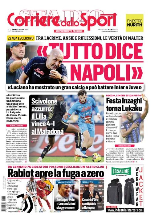 Il Corriere dello Sport, edizione Campania, ha dedicato spazio in prima pagina all'intervista a Walter Zenga: "Tutto dice Napoli. Luciano ha mostrato un gran calcio e può battere Inter e Juve". Tra lacrime, ansie e riflessioni, la verità di Walter". C'è spazio anche per l'amichevole persa 4-1 dagli azzurri: "Scivolone azzurro: il Lille vince 4-1 al Maradona".