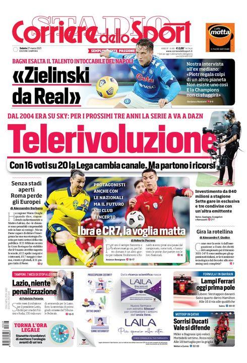 "Zielinski da Real", questo è il titolo di apertura della prima pagina del Corriere dello Sport nella sua edizione Campania. "Bagni esalta il talento intoccabile del Napoli. Piotr regala colpi di un altro pianeta. Non esiste uno così. E la Champions non ci sfuggirà".