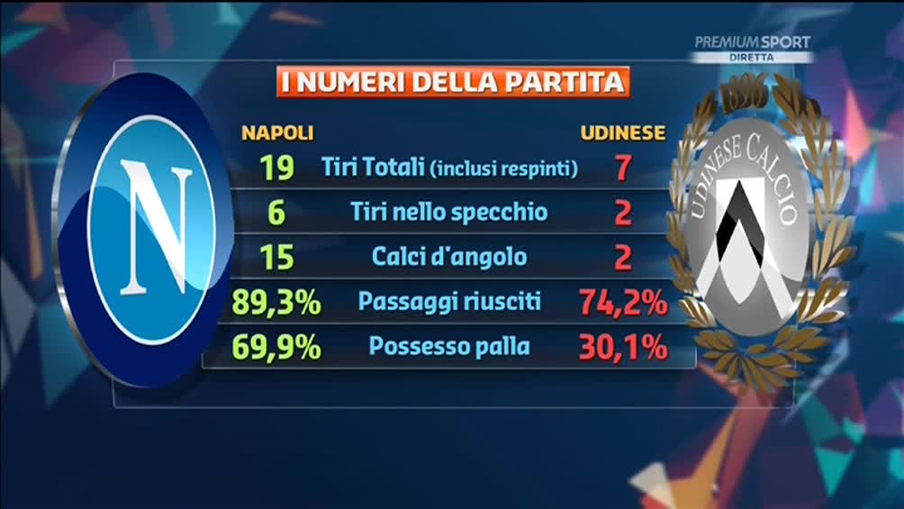 Nello schema pubblicato su Twitter da Premium Sport, ecco i numeri di Napoli-Udinese: 69,9% di possesso palla per gli uomini di Sarri.