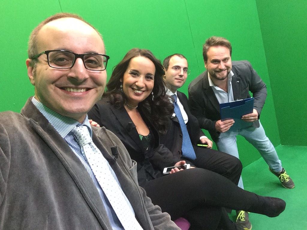 "#OndAzzurra in diretta dalle 21:30 alle 23 su @julieitalia vi aspettiamo :) #ForzaNapoliSempre", scrive su Twitter Antonio Petrazzuolo, direttore di Napoli Magazine, pubblicando la sottostante foto, scattata con Raffaella Iuliano, Livio Varriale e Lucio Pengue.