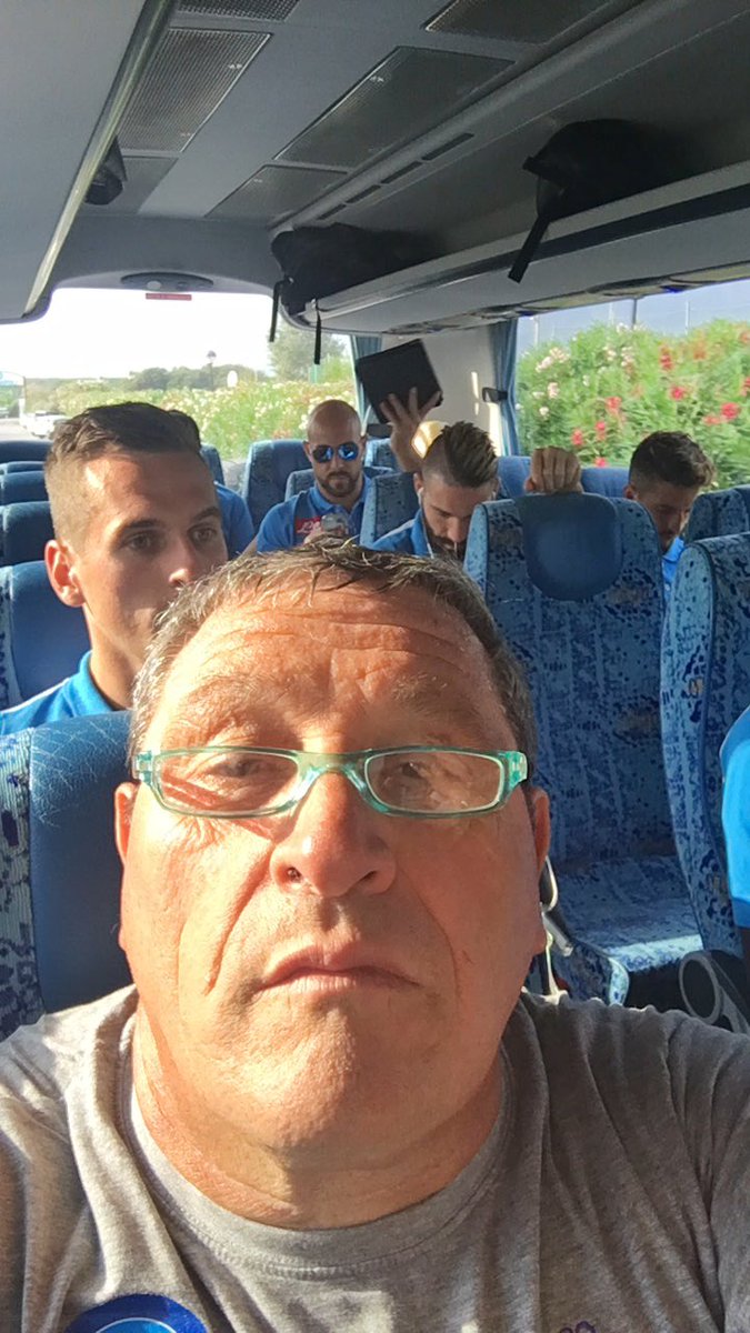 "In partenza da Castel Volturno per Palermo", scrive su Twitter Tommaso Starace, storico magazziniere del Napoli, pubblicando un selfie scattato sul pullman degli azzurri diretto all'aeroporto di Capodichino, destinazione Palermo.