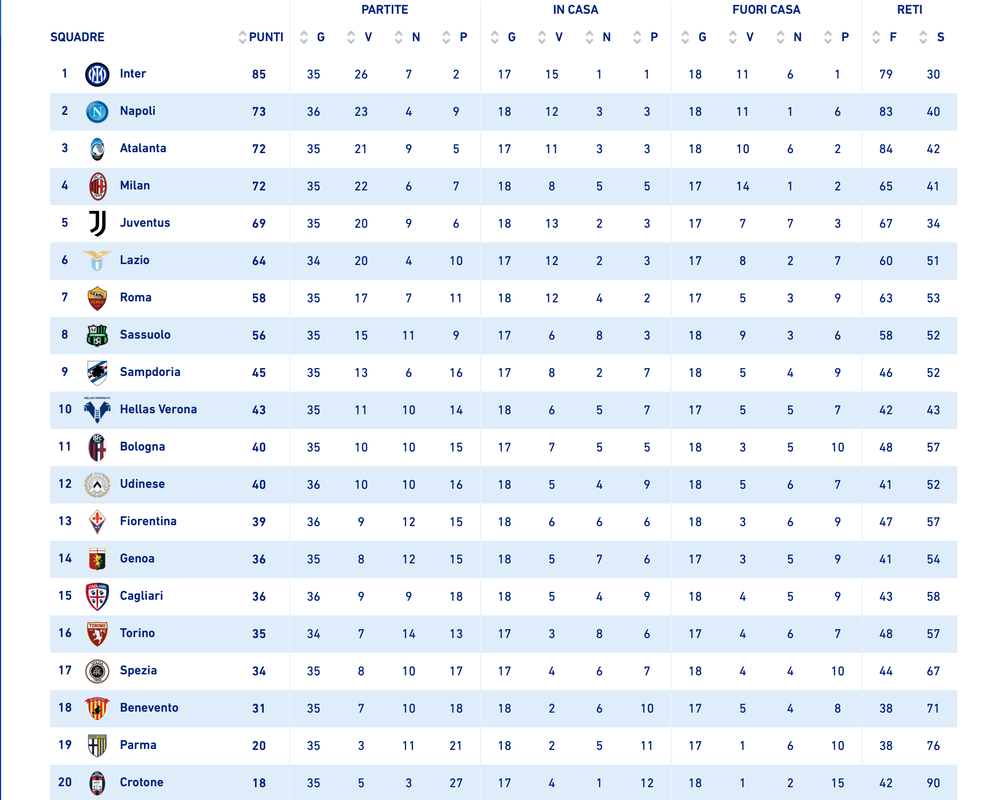 In attesa che si completi la 36esima giornata di Serie A, Fiorentina e Cagliari pareggiano per cui la loro situazione in classifica resta invariata e abbastanza serena per la zona salvezza. Di seguito la classifica provvisoria.