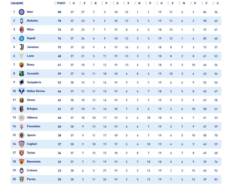 Finisce a reti inviolate l'ultima gara in Serie A per il Crotone che contro la Fiorentina ottiene un punto che gli permette di non chiudere all'ultimo posto in classifica restando davanti al Parma. I viola invece non riescono a superare il Bologna e si fermano a 40 punti. Obiettivo raggiunto per Claudio Ranieri e la sua Sampdoria. Con il 3-0 al Parma infatti conclude, come aveva pronosticato, il campionato a quota 52 punti nella sua ultima gara da tecnico blucerchiato, addio anticipato ieri. Chiude desolatamente ultimo il Parma invece che dopo tre anni torna in serie B e potrebbe salutare il tecnico D'Aversa, indicato tra i candidati a sostituire proprio l'allenatore romano. Ma la sfida del Ferraris è anche la gara numero 500 in serie A per Fabio Quagliarella che segna il suo gol numero 99 con la Sampdoria, titolare in attacco con Gabbiadini, in gol anch'egli. A segno anche Colley. Il Genoa vince contro il Cagliari. Ecco di seguito la classifica provvisoria aggiornata della Serie A.