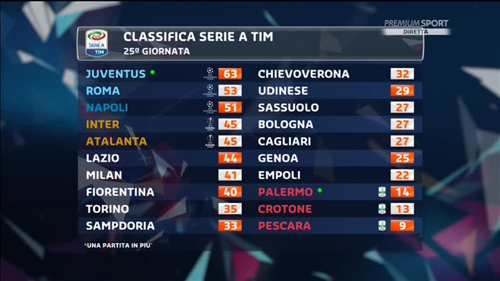 Nello schema pubblicato su Twitter da Premium Sport, ecco la classifica aggiornata dopo l'anticipo del venerdì Juve-Palermo 4-1.