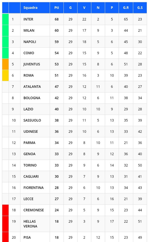 Ecco la classifica della 29esima giornata di Serie A: