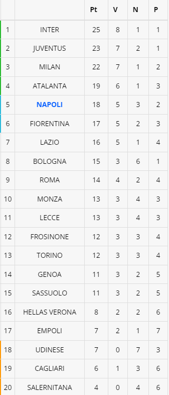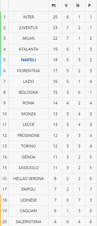 La Lazio vince all'ultimo respiro contro la Fiorentina, grazie al rigore decisivo messo a segno da Ciro Immobile. La squadra di Sarri sale a 16 punti, a -1 proprio dalla Fiorentina. Di seguito la classifica dopo la decima giornata.