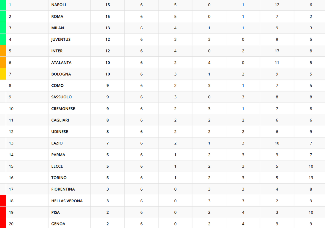 SERIE A - La classifica dopo la sesta giornata: la Juventus aggancia l'Inter, Milan a -2 da Napoli e Roma