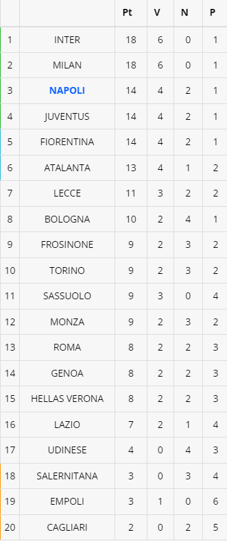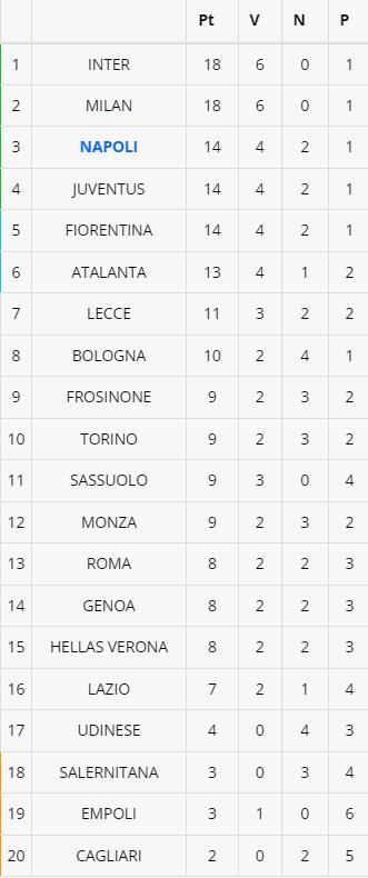 La Fiorentina piega 3-0 il Cagliari e aggancia al terzo posto la Juventus e il Napoli a quota 14 punti. Di seguito la classifica dopo la settima giornata di Serie A.