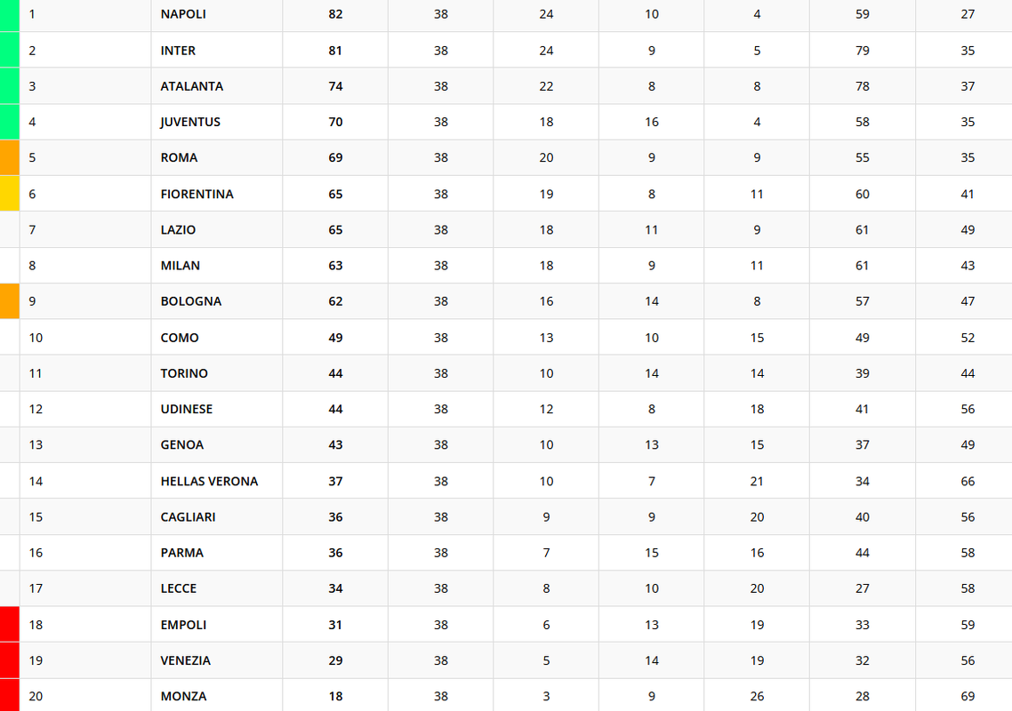 Si chiude la Serie A 2024/2025, dopo la 38esima giornata. Il Napoli vince lo Scudetto con 82 punti. In Champions League, a far compagnia a Napoli, Inter e Atalanta, arriva la Juventus, che chiude il suo campionato al quarto posto a quota 70 punti. In Europa League, insieme al Bologna fresco vincitore della Coppa Italia, ci sarà la Roma, ferma a quota 69 al quinto posto. In Conference toccherà invece alla Fiorentina, che termina sesta a quota 65 punti. Restano in A Hellas Verona (37 punti), Parma (36 punti) e Lecce (34 punti). In Serie B, Empoli, Venezia e Monza. Ecco la classifica finale dopo la 38esima giornata.
