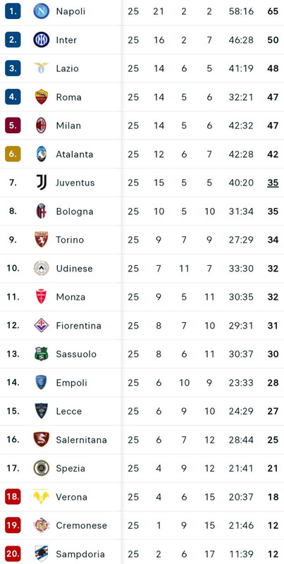 Il Torino vince l'ultimo match della giornata contro il Bologna e sale al nono posto, a quota 34 punti. Il Bologna resta ottavo, a pari punti con la Juventus. Di seguito la classifica dopo la 25esima giornata.