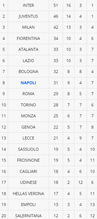 L'Atalanta vince nel match contro il Frosinone e sale a quota 33 punti. La Dea supera Napoli e Bologna e aggancia la Lazio, portandosi a -1 dal quarto posto occupato dalla Fiorentina. Il Frosinone resta a quota 19 punti con il Sassuolo. Di seguito la classifica provvisoria.