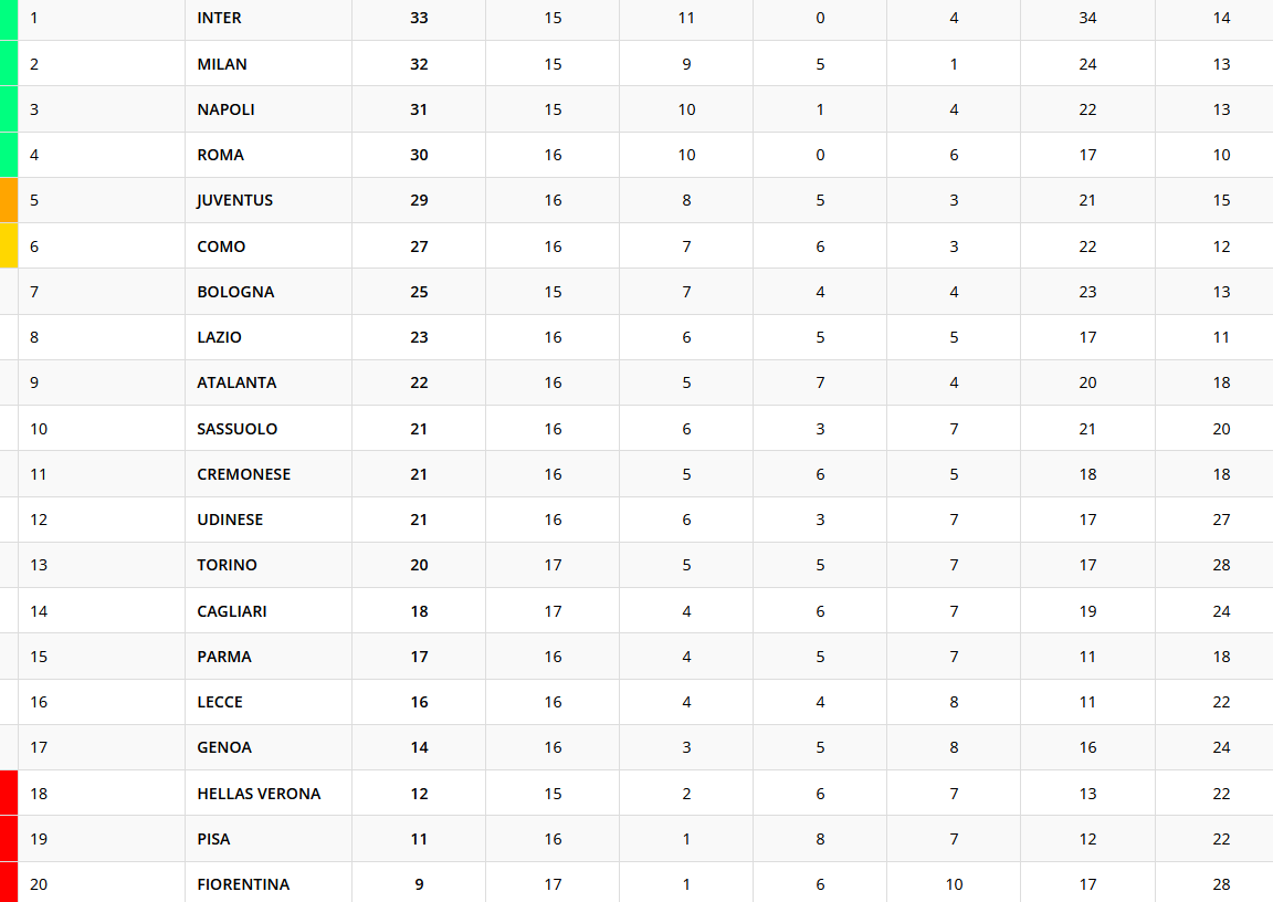 SERIE A - La classifica provvisoria: Como al sesto posto, Cagliari a -2 dal Torino
