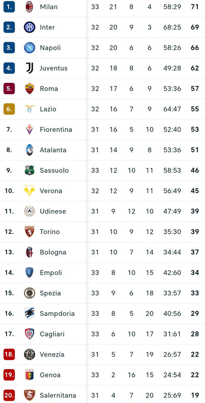 L'Udinese, dopo il successo per 4-1 contro l'Empoli (il terzo di fila in campionato), sale a quota 39 punti raggiungendo il Torino all'undicesimo posto. I toscani, invece, restano fermi a quota 34 punti e conservano ugualmente ben 12 punti di vantaggio sulla zona retrocessione. Nel match salvezza tra Sampdoria e Salernitana, invece, a spuntarla sono gli ospiti che tornano al successo e salgono a quota 19 punti. I granata di Nicola, quindi, tornano a sperare nella salvezza visti i 9 punti di distacco dal Cagliari quartultimo e i due match da recuperare. I blucerchiati restano invece fermi a quota 29 punti, a +7 sulla zona retrocessione. Ecco la classifica provvisoria della Serie A:
