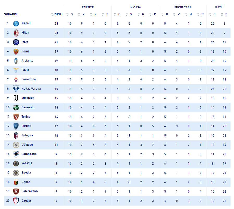 Il sabato calcistico dell'undicesima giornata di campionato termina con sorprese e conferme. Nel match delle 15:00, l'Atalanta strappa, in extremis, un punto alla Lazio che, avanti 2-1, ha subito il gol di De Roon nei secondi finali. Le due squadre mantengono la quinta e la sesta posizione con la Dea che aggancia virtualmente la Roma. Cade nuovamente la Juventus che scivola al nono posto in classifica dopo la sconfitta per 2-1 contro l'Hellas Verona, doppietta di Simeone, che inizia ad avere ambizioni europee visti i punti in classifica. Anche il Torino inizia a pensare alle zone nobili della classifica dopo aver battuto la Sampdoria 3-0.