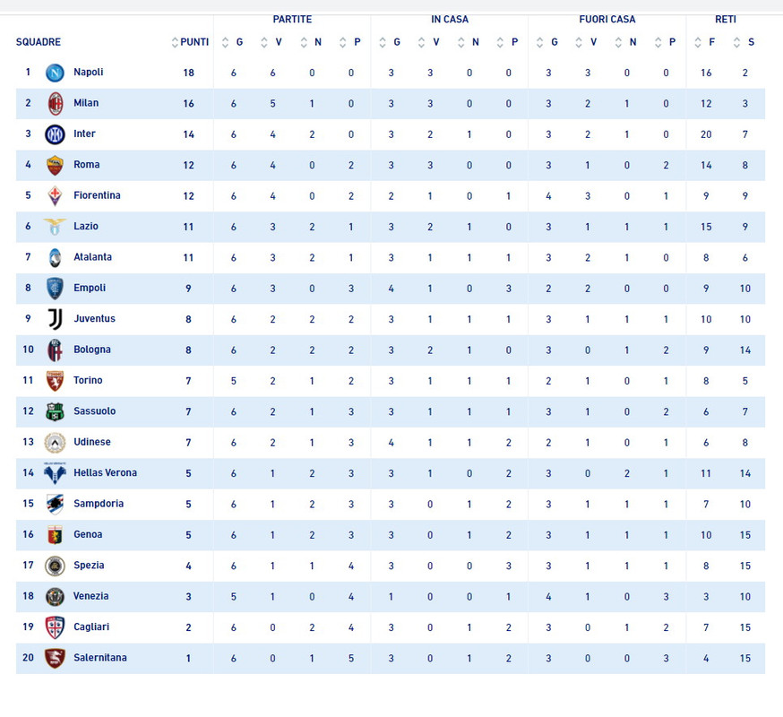 Sesta vittoria consecutiva del Napoli che riconquista la testa della classifica. Partita dominata dagli uomini di Spalletti che non trovano troppe difficoltà ad avere la meglio sul Cagliari, grazie alla rete del solito Osimhen e al rigore realizzato dal capitano Insigne, che festeggia la 400esima presenza nel migliore dei modi. Mazzarri deve correre subito ai ripari e iniziare a lavorare sui suoi uomini, se vuole conquistare punti utili per portare il suo Cagliari alla salvezza. Ecco la classifica provvisoria della sesta giornata.