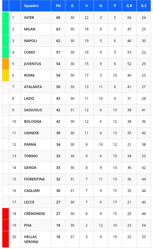 Ecco la classifica provvisoria della 31esima giornata di Serie A:
