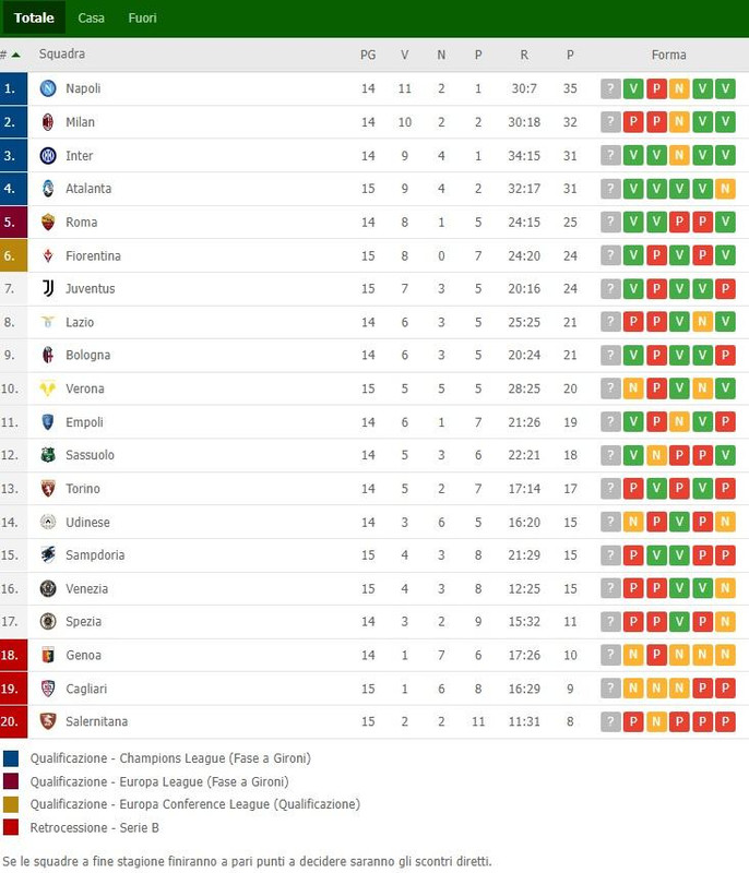 Si sono conclusi gli anticipi del turno infrassettimanale, match validi per la 15^ giornata del campionato di Serie A. Fiorentina e Juventus, grazie ai rispettivi successi contro Sampdoria e Salernitana, si sono portate a -7 dalla zona Champions League mentre l'Atalanta, dopo il 4-0 rifilato al neopromosso Venezia, ha raggiunto l'Inter al quarto posto in attesa dei match di domani. Ecco la classifica provvisoria: