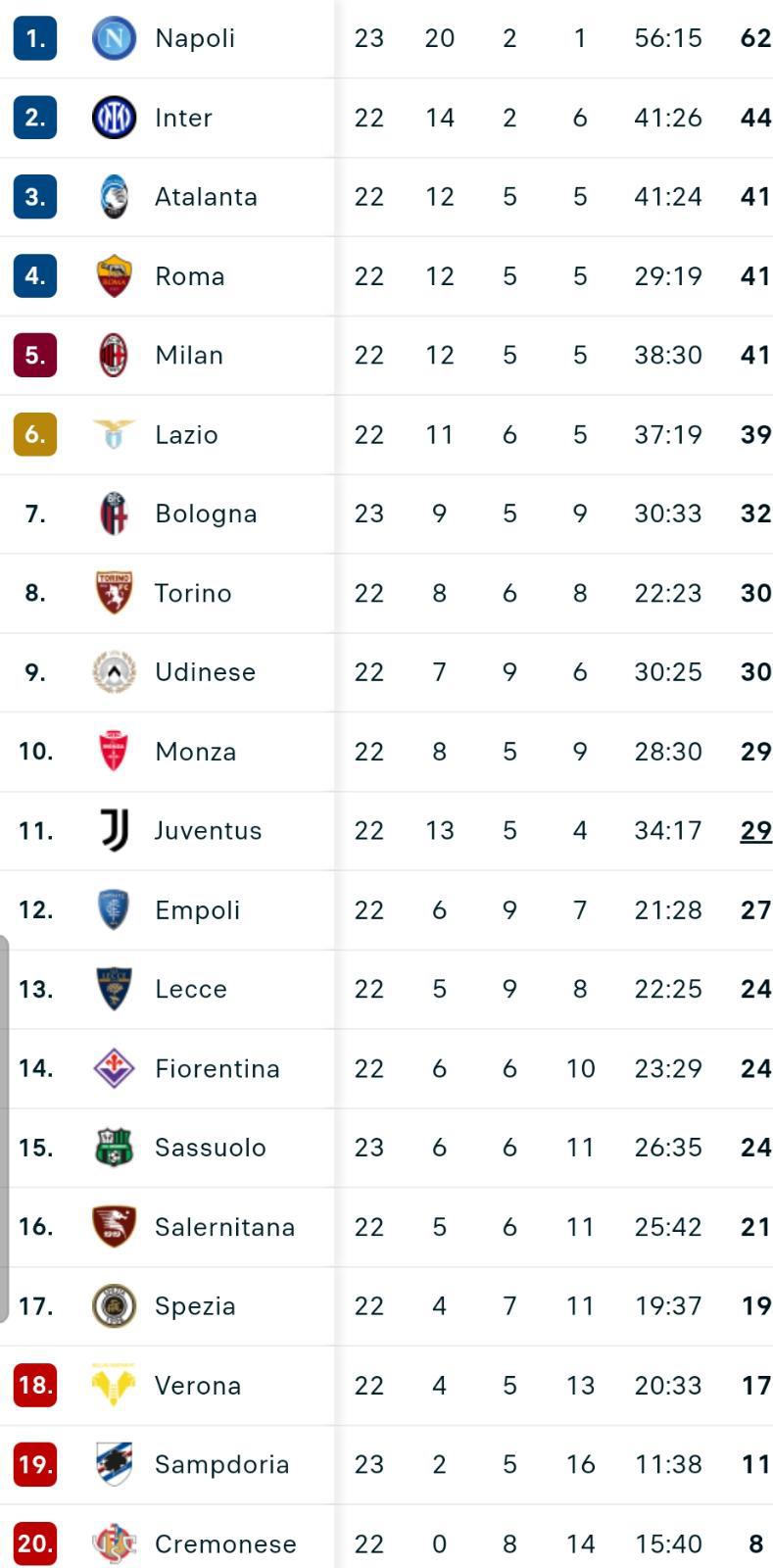 Il Bologna vince contro la Sampdoria e va a quota 32 punti, superando Udinese e Torino. La squadra di Stankovic resta ferma a quota 11 punti, al penultimo posto. Di seguito la classifica provvisoria.
