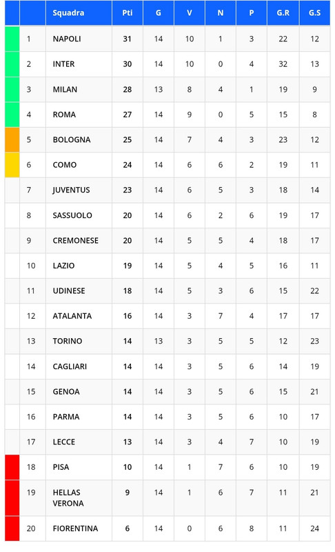 Ecco la classifica provvisoria della 14esima giornata: