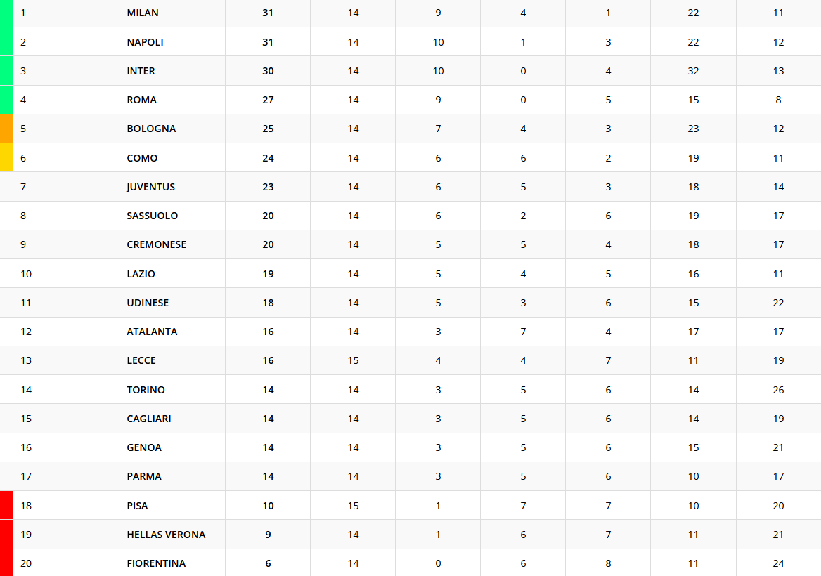Il Lecce vince di misura il match contro il Pisa, che apre la 15esima giornata di Serie A. La squadra di Eusebio Di Francesco sale a quota 16 punti, agganciando l'Atalanta. Il Pisa resta a quota 10 punti. Ecco la classifica provvisoria della 15esima giornata.