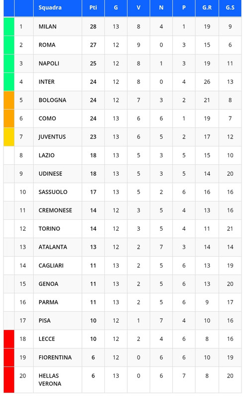 Di seguito, la classifica provvisoria della 13esima giornata: