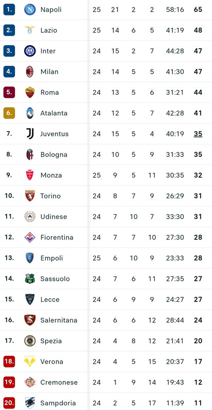 Il Monza, grazie al successo per 2-1 contro l'Empoli, sale a quota 32 punti e si porta così al nono posto. I toscani, invece, restano fermi a quota 28 punti in tredicesima posizione. Ecco la classifica provvisoria della Serie A: