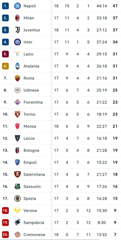 Il Monza, grazie al successo in trasferta per 2-3 contro la Cremonese, sale a quota 21 punti e si porta così all'11° posto, a -2 dalla Top 10. La Cremonese, invece, resta ultima con 7 punti ed ancora a secco di vittorie in campionato. Ecco la classifica provvisoria della Serie A: