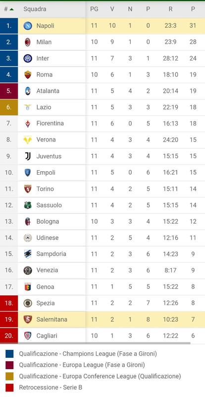 Con la vittoria di misura contro la Salernitana, il Napoli si aggiudica il derby campano e mantiene in solitaria la vetta della classifica, in attesa del match tra Roma e Milan. Di seguito la classifica provvisoria.