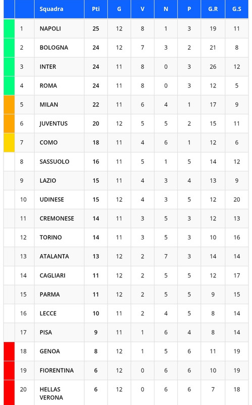 Di seguito, la classifica provvisoria della 12esima giornata di Serie A.