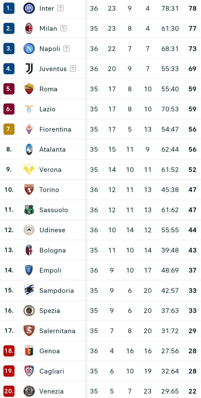 Con il pareggio contro l'Udinese al Mapei Stadium, il Sassuolo aggancia il Torino a quota 47 punti. La squadra di Cioffi stacca il Bologna e va a quota 44 punti. Di seguito la classifica aggiornata.