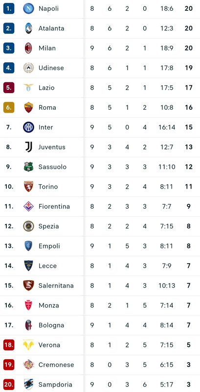 Il Torino, dopo l'1-1 acciuffato nel finale contro l'Empoli, sale a quota 11 punti ma resta al decimo posto. I toscani, invece, salgono a quota 8 punti ed ottengono un buon risultato, nonostante la beffa finale, che li proietta al al tredicesimo posto. Ecco la classifica provvisoria della Serie A: