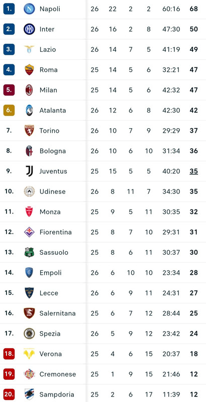 Il Torino, grazie al successo sul campo del Lecce, sale a quota 37 punti e si porta così al momento al settimo posto. I pugliesi, invece, restano a quota 27 punti, a +9 sulla zona retrocessione. Ecco la classifica provvisoria della Serie A: