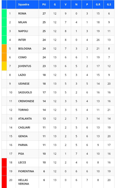 SERIE A - La classifica provvisoria: Juventus a -2 dal Napoli