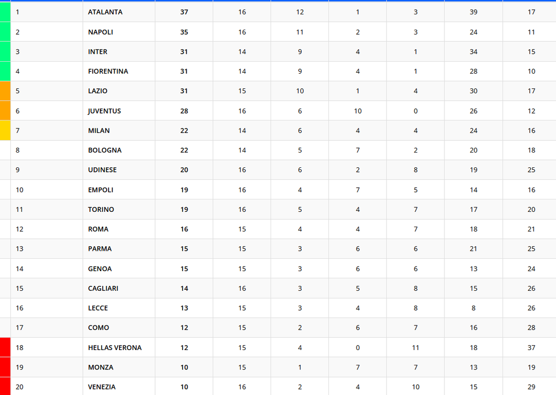 La Juventus non va oltre il pari in casa con il Venezia, nel match valido per la 16esima giornata di Serie A. I bianconeri salgono a quota 28 punti, a -3 da Fiorentina, Lazio e Inter. Il Venezia resta ultimo a quota 10 punti. Ecco la classifica provvisoria.