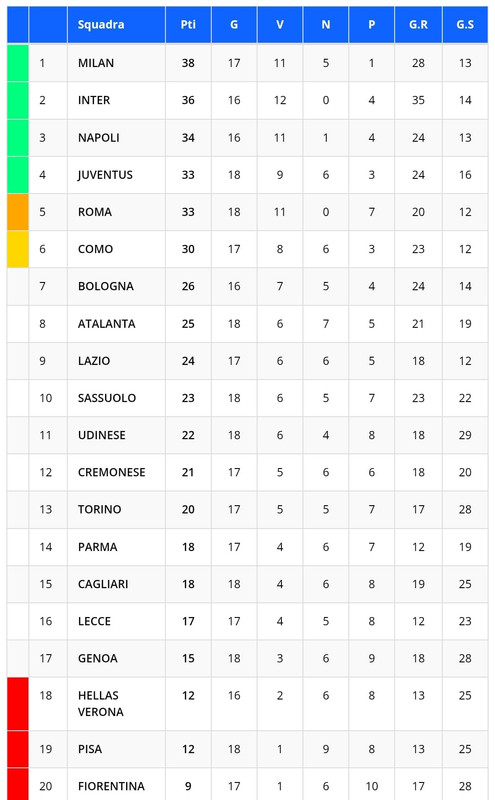 Ecco la classifica provvisoria della 18esima giornata di Serie A: